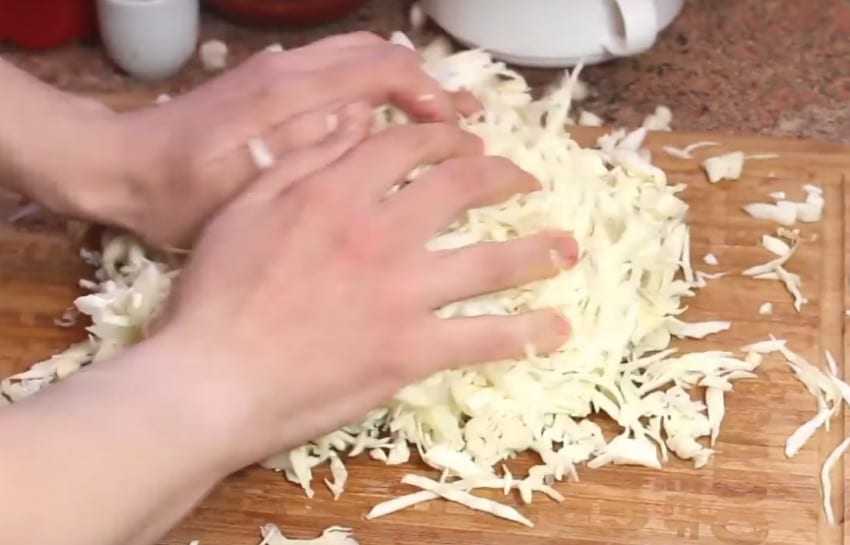2. Капусту нашинкуйте и посолите ее. Затем немного помните руками до мягкости.