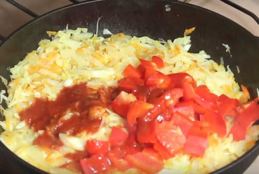 4. К содержимому сковороды добавьте капусту и тушите на меньшем огне 15 минут.Порежьте болгарский перец кубиками и добавьте его на сковороду. Туда же положите томатный соус. Тушите овощи под крышкой еще 15 минут.