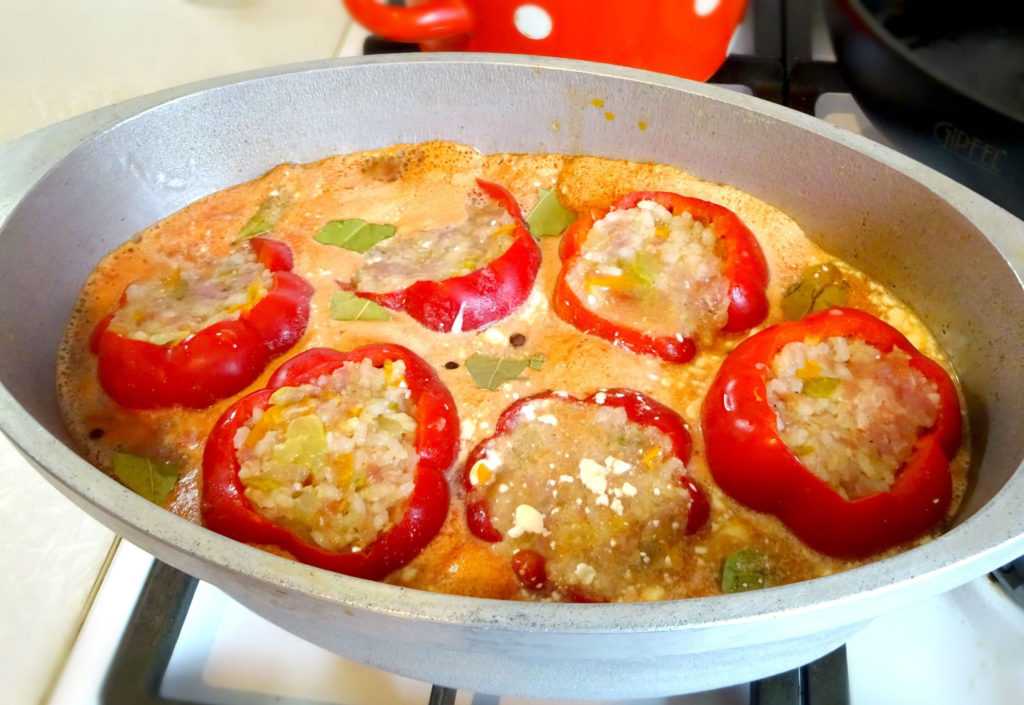 Бонус: фаршированные перцы лодочки под сметанным соусом на сковороде