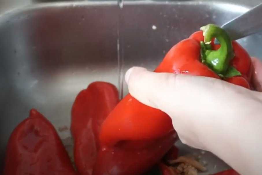 - У перцев отрежьте заднюю часть, аккуратно вычистите семена и мягкие перегородки внутри, чтобы не повредить целостность плода, ополосните, промокните салфетками.