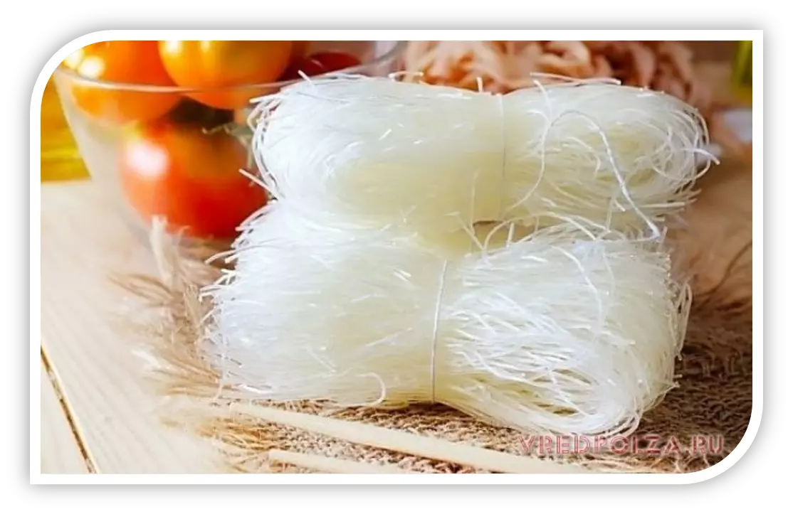 Рисовую лапшу залить холодной водой и оставить на 4-5 минут, за это время она отмякнет и промоется.