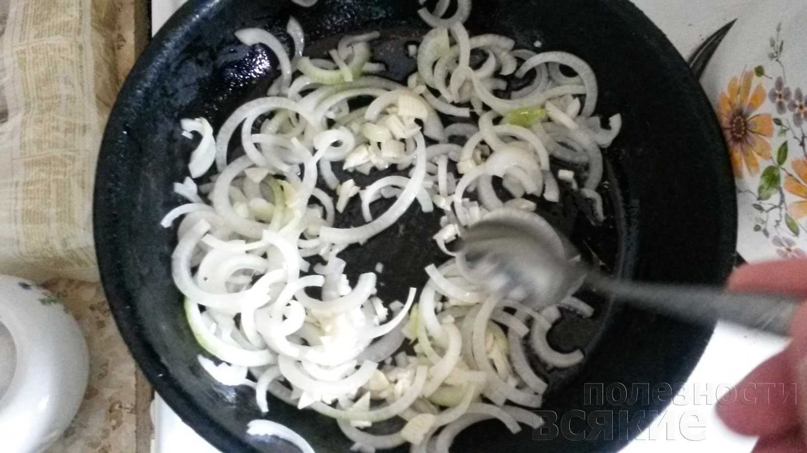 Пока лук еще жарится, нарезаем дольку чеснока и добавляем к луку. Обжариваем таким образом лук и чеснок на сковороде до золотистого цвета.