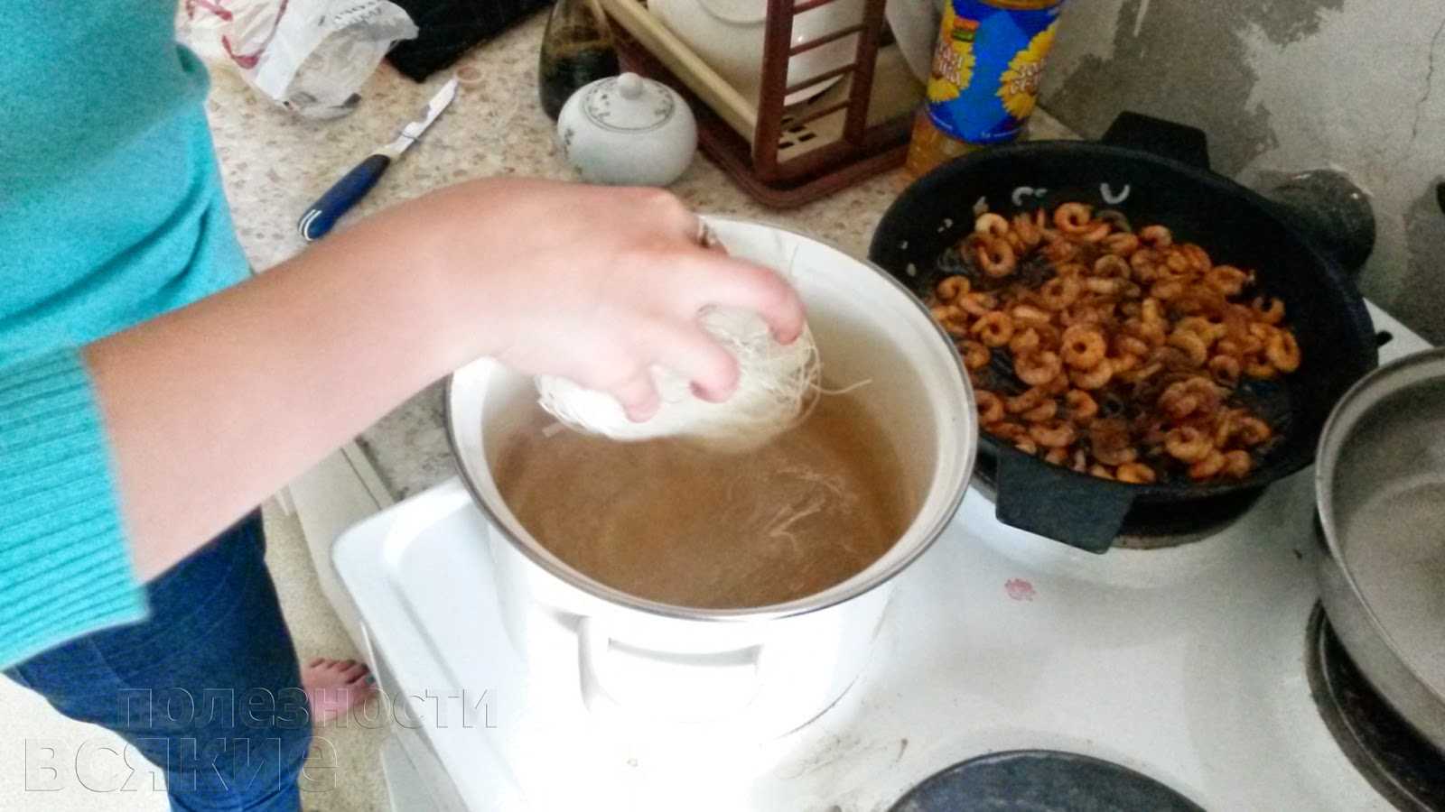 Пока обжариваются креветки, в уже закипевшую кастрюлю с водой закидываем фунчозу, ее варить не надо, поэтому просто запариваем в кипятке 4 минуты.