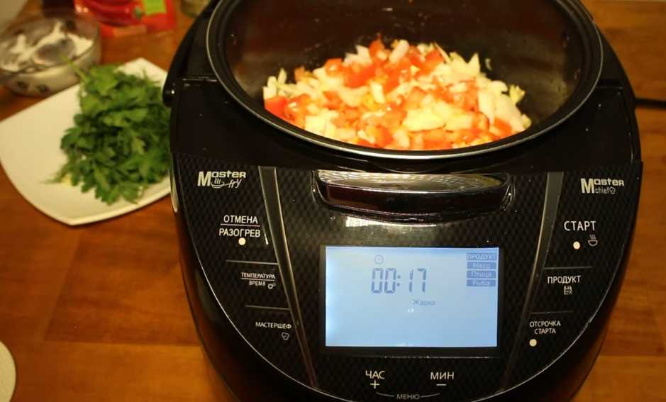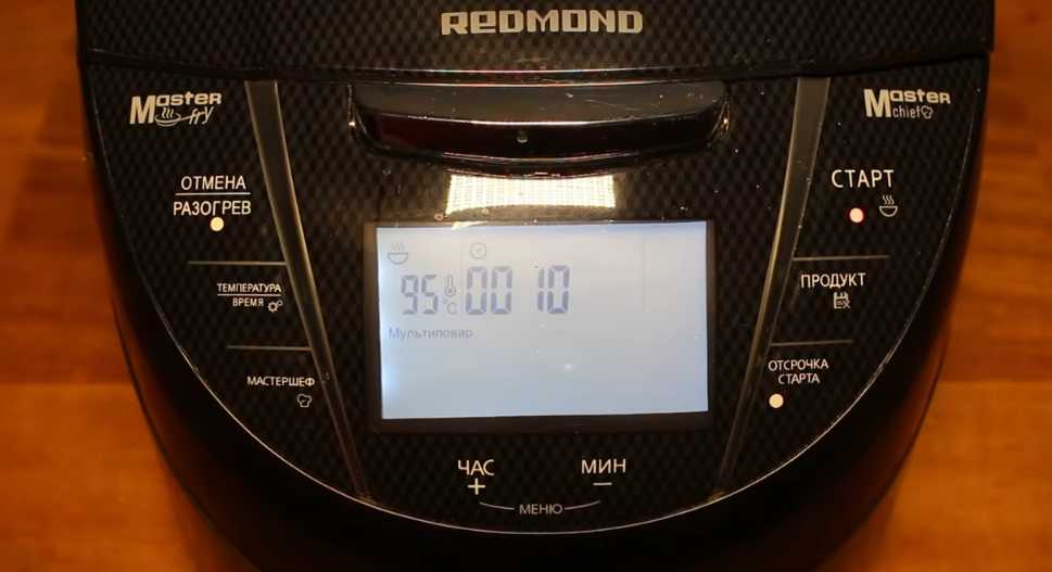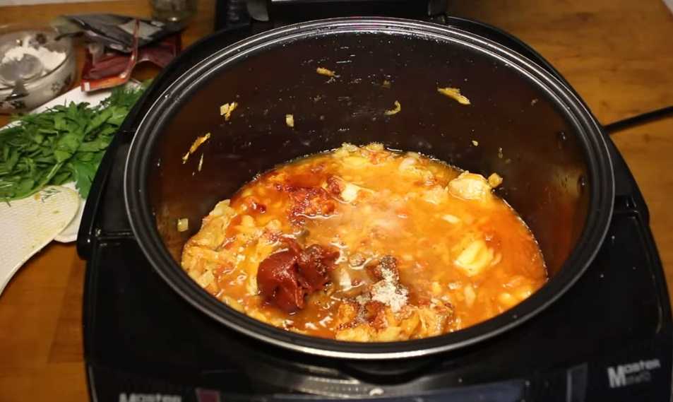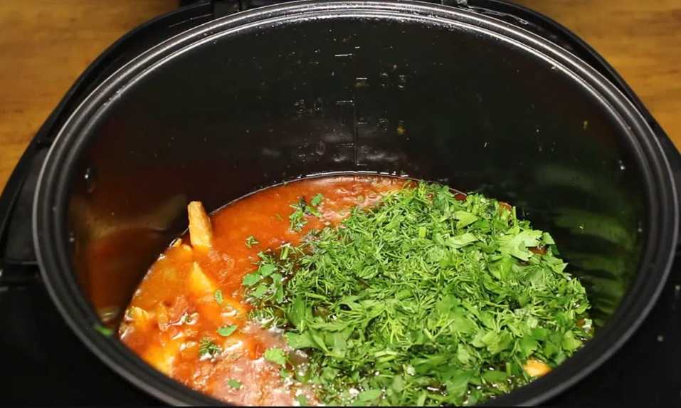 Затем закрываем крышку, выбираем режим «Мультиповар» и устанавливаем температуру на 95 градусов, а время ставим 10 минут. Так как мясо и овощи у нас готовы, много времени не нужно. Если на вашей модели нет такого режима, поставьте на «Тушение», а через 10 минут отключите мультиварку самостоятельно.