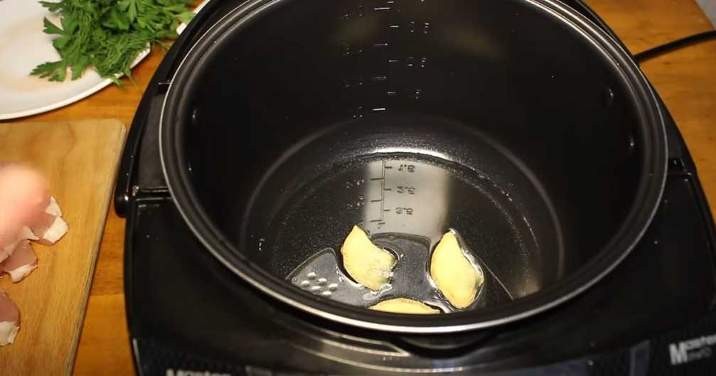 Мультиварку включите на режим «Жарка», налейте подсолнечное масло так, чтобы оно полностью покрывало дно. Пока чаша нагревается, положите в масло тонкие пластинки корня имбиря.