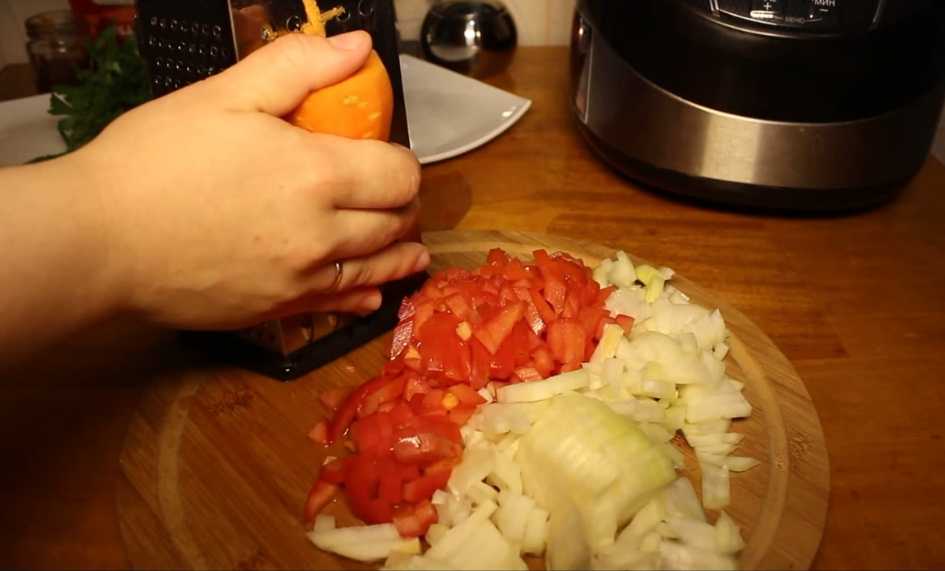 Лук и помидоры нарежем небольшими кубиками. Морковь натрите на крупной терке.