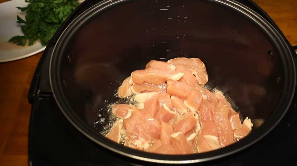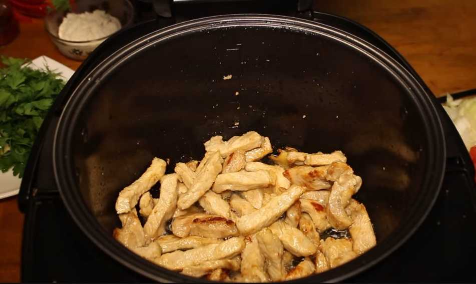 Чаша мультиварки нагрелась, добавляем мясо, корень имбиря не извлекаем, он должен оставаться в кастрюльке мультиварки до конца приготовления. Так имбирь отдаст все свои вкусовые качества.
