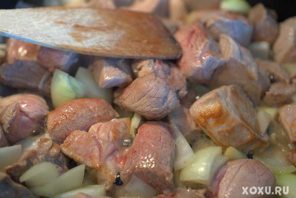 Шаг 2. Обжариваем 15 минут мясо на сковороде, периодически помешивая… Во время приготовления, мясо выделяет сок, который испаряется.