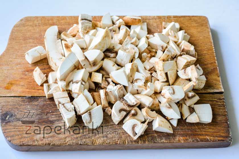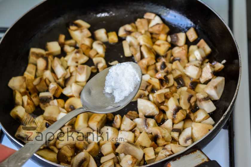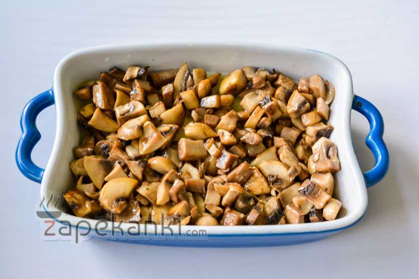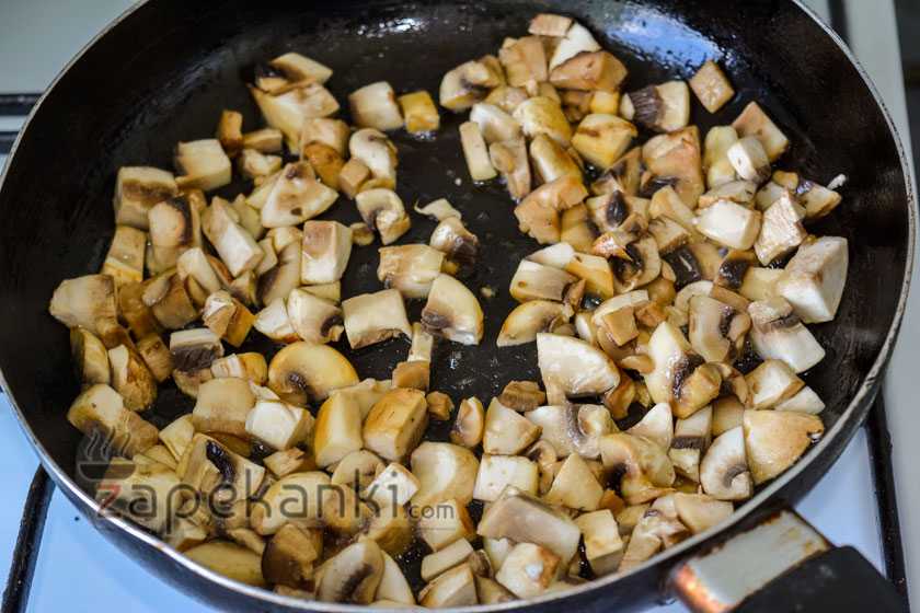 2. Пожарьте грибы перед запеканием, иначе они выпустят много сока во время пребывания в духовке и в форме будет просто размазня.