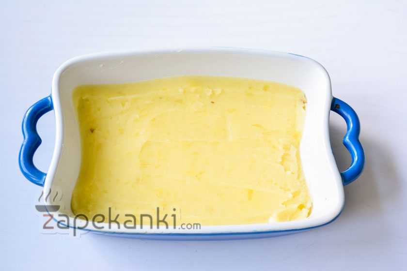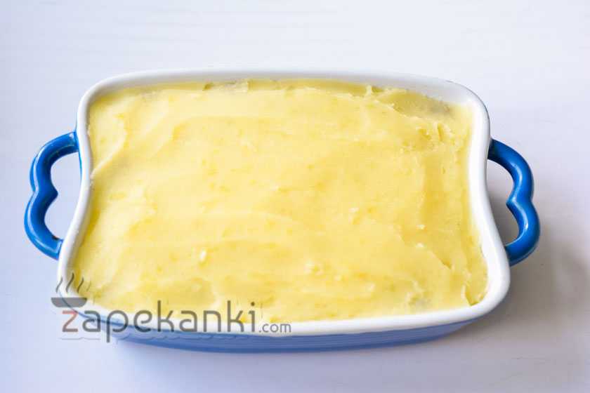 8. На дно формы выкладываем половину картофельного пюре.