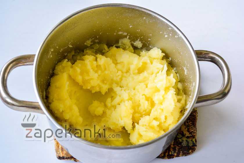 2. Толчем картофель ступкой или пюрируем блендером. Особо можете не стараться, небольшие картофельные комочки придадут массе вязкости, за счет которой картофельная запеканка с грибами будет лучше держать свою форму.