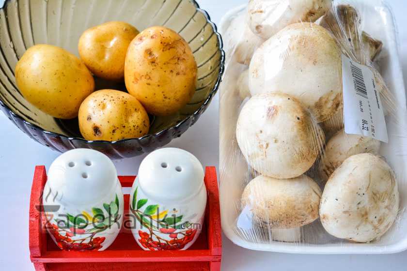 Для такой постной запеканки в духовке из картошки дополнительно нужны свежие шампиньоны. Начинка требует предварительного обжаривания, но это нужно только для удаления лишней влаги и улучшения вкуса грибов.