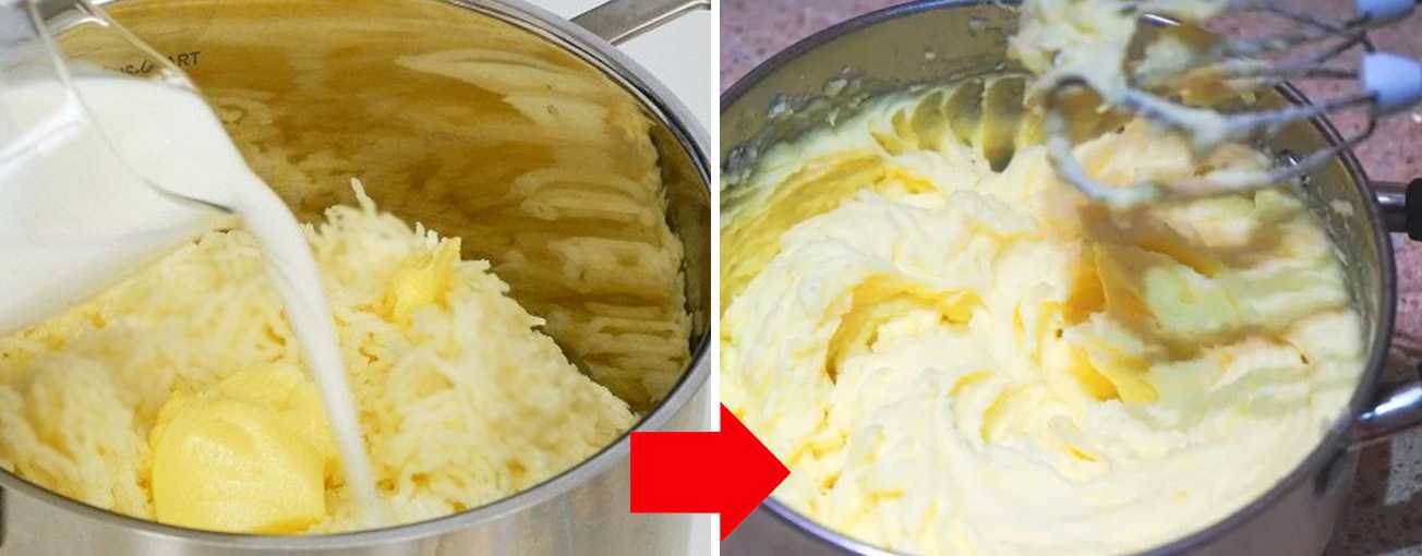 2. Прогреваем молоко с добавлением сливочного масла. Порционно вливаем горячее молоко в размятый картофель, продолжаем разминать до состояния пюре.