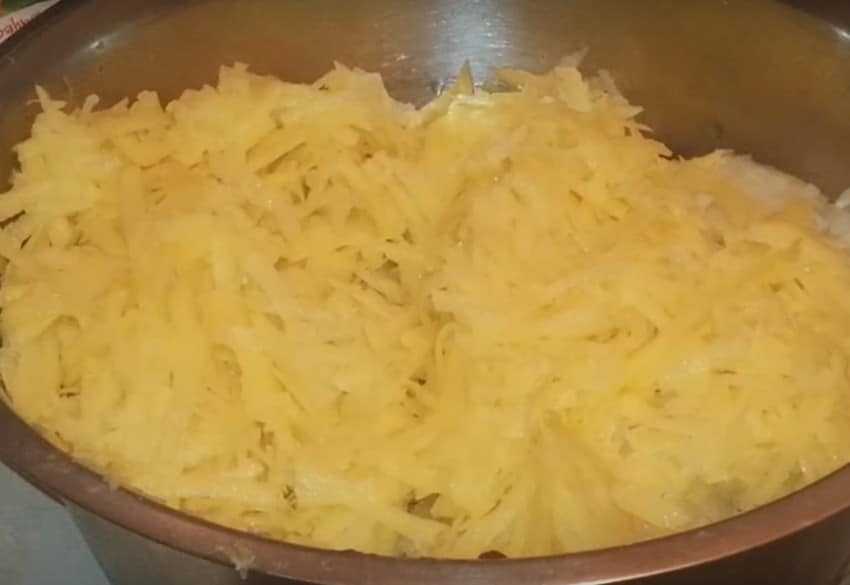 - Трем кабачок (если он зрелый достаточно вычистить косточки) и картофель в равных пропорциях.