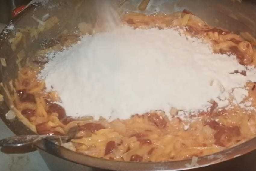 - После чего следует всыпать муку и еще размешать.