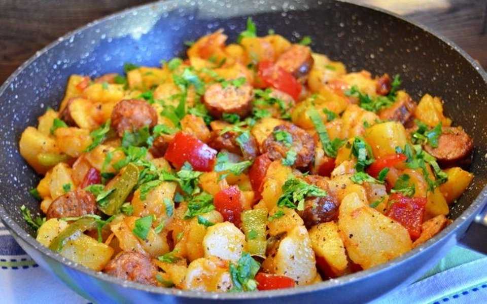 === Для рецепта Вам понадобится ===Охотничьи колбаски – 600гр;Картофель – 1.5кг;Лук репчатый – 2шт;Болгарский перец – 1шт;Чеснок — 3зуб;Укроп;Растительное масло;Хмели сунели – 2ч.л;Куркума – 2ч.л;Свежемолотый перец;Соль;