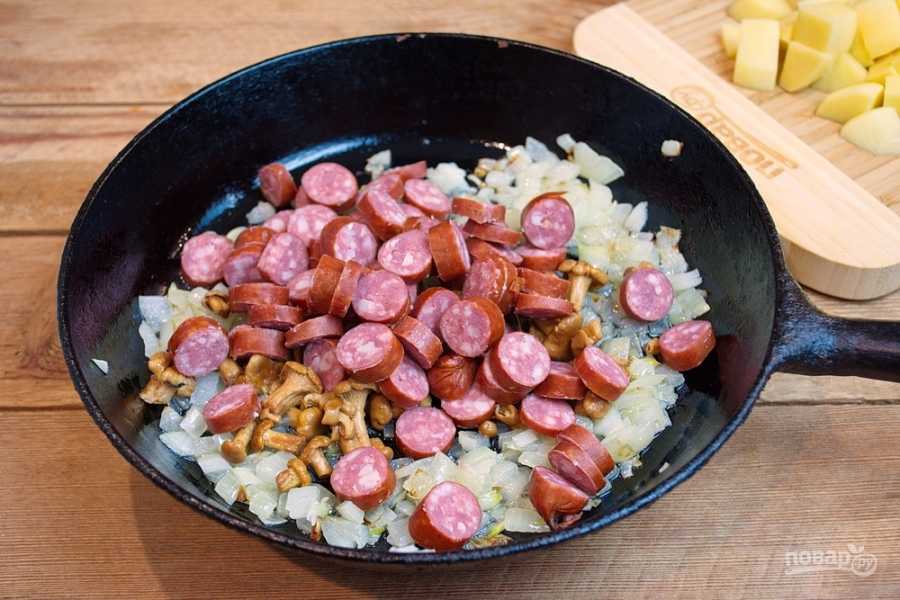 видео-рецепт приготовления с вареной колбасой и охотничьими колбасками