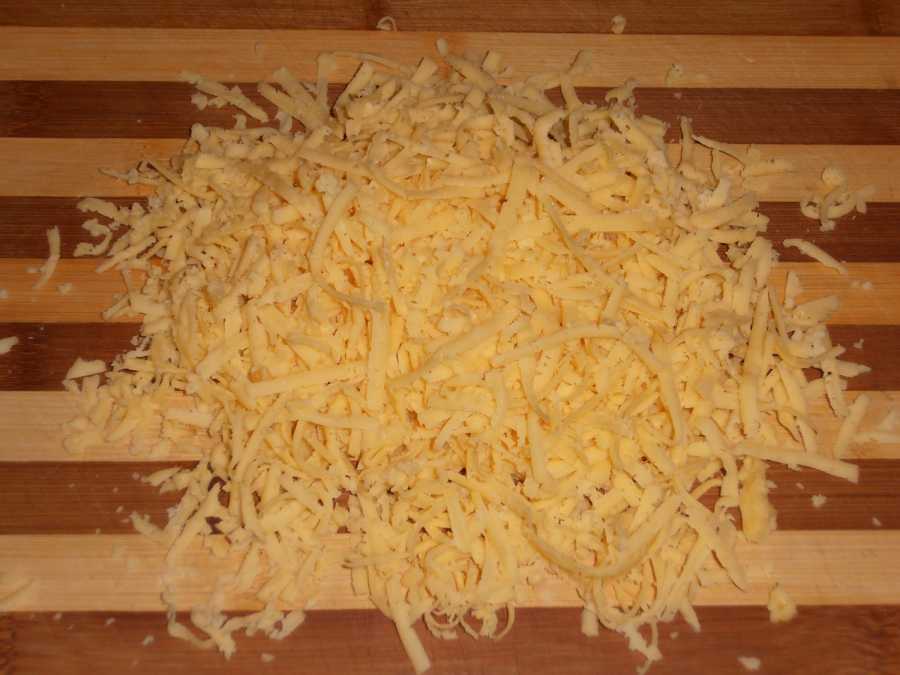 Сыр натереть на крупной терке и выложить слоем на колбасу.