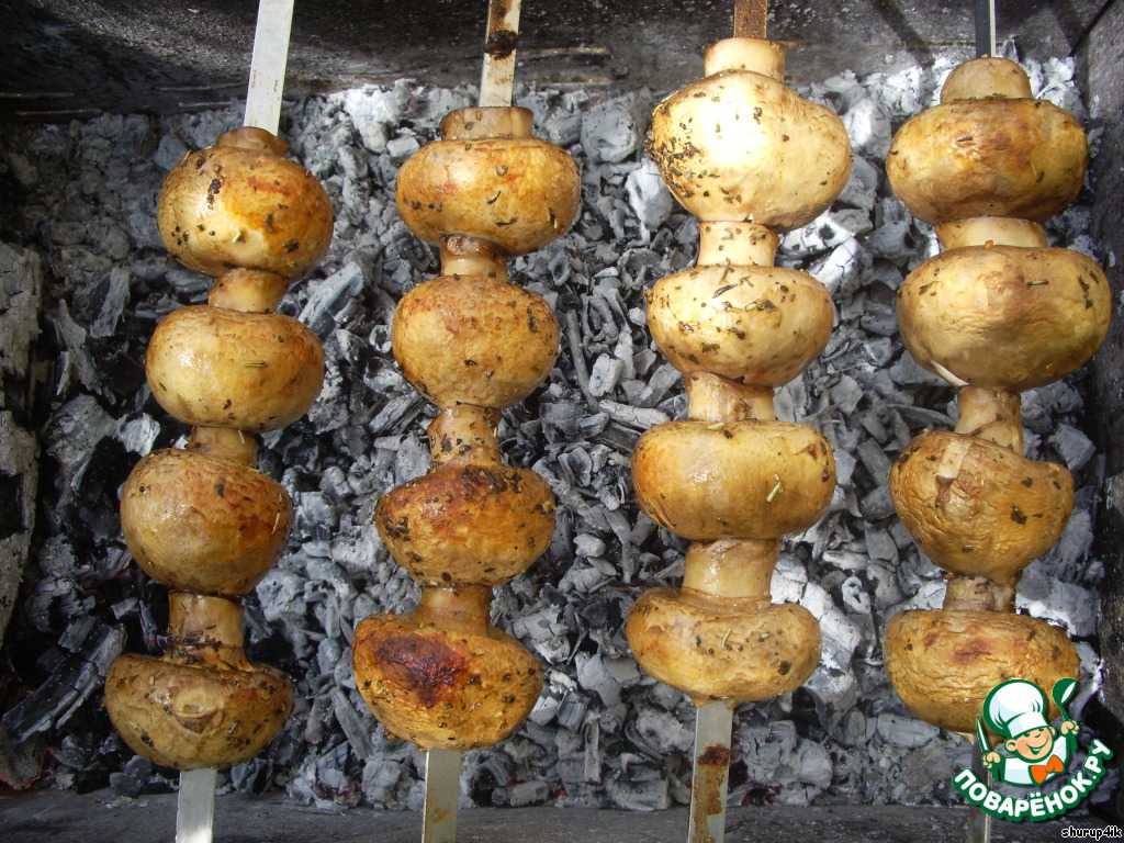 Затем насадить шампиньоны на шампуры и жарить до готовности. Грибы должны значительно уменьшиться в размере и стать золотистыми.