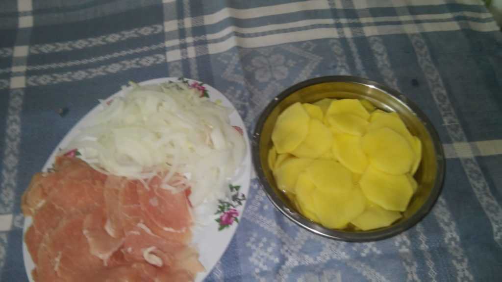 - Первый слой картошка, сверху лук, третий слой мясо.