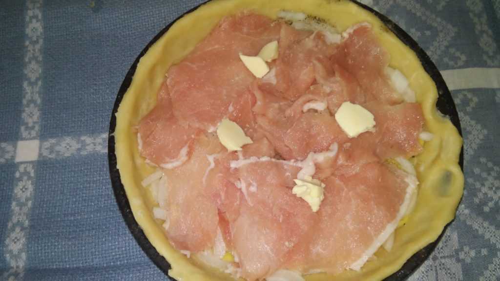 - Раскатать вторую часть теста и выложить поверх начинки.