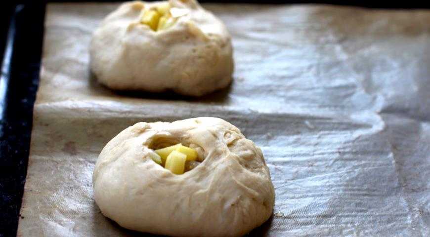 Шаг 4.Каждый кусочек расплющить и растянуть. В центр положить около 2 ст.л начинки, края лепешки соединить сверху, оставив небольшую дырочку, или склеить в виде треугольника. Дать заготовкам расстояться на противне 15 минут, смазать сверху желтком со сливками. Шаг 4