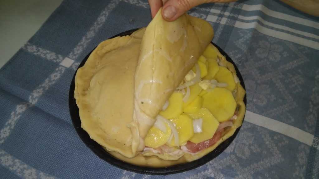 - Закрываем пирог, тщательно защипываем края, в середине проделываем отверстие, для выхода пара.