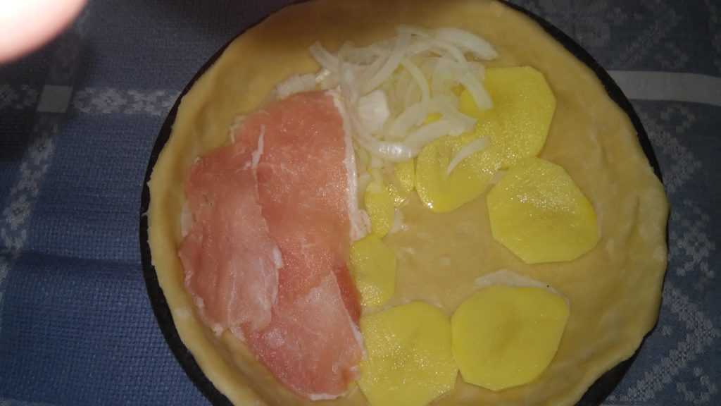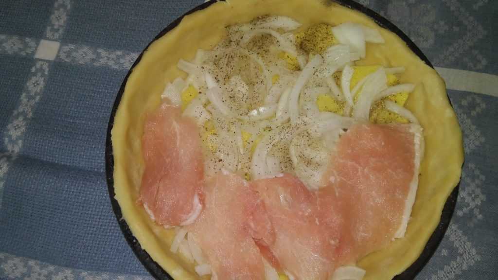 - Слоями выкладывать картофель, лук, фарш, натертый сыр. Посолить, поперчить. Накрыть тестом, выполнить отверстие в центре.
