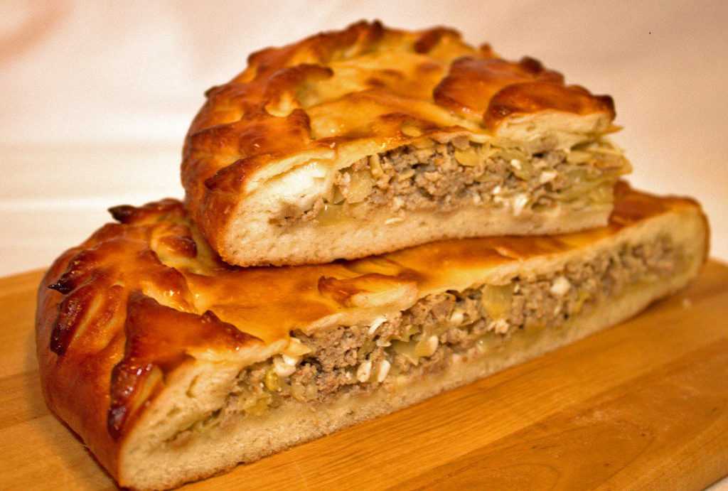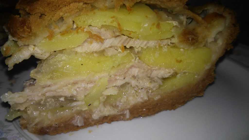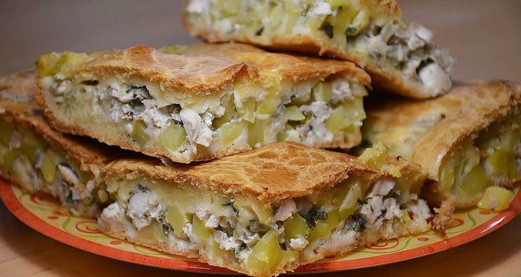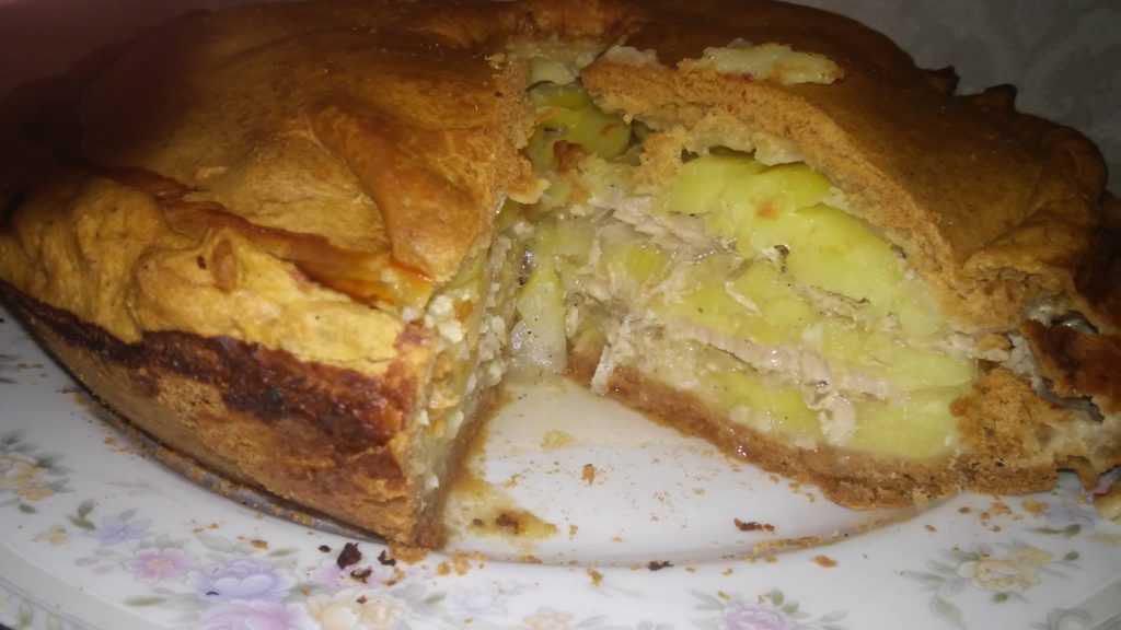 Приготовление: 1. Картошку порежь тонкими пластинками, смешай с рубленой зеленью, специями и 1 ст. л. растопленного сливочного масла. 2. Грибы порежь пластинками, обжарь на сливочном масле до образования светло-золотистой корочки. 3. Куриное мясо разбери на волокна, приправь пряностями, полей сливочным маслом. 4. Тесто раскатай в прямоугольник толщиной 3-5 мм, в центр лепешки положи блинчик, покрой его мясной начинкой, сверху уложи еще два блинчика, перемазанных сливочным маслом. 5. Распредели картофельную начинку, накрой оставшимся блинчиком, поверх которого выложи грибы. 6. Свободные края теста подними вверх и скрепи вместе над горкой начинки, должен получиться пирог, по форме напоминающий купол. Смажь желтком, укрась вырезанными из обрезков теста фигурками, которые тоже надо смазать желтковой массой. Выпекай 50-55 минут в духовке при 200-х градусах.