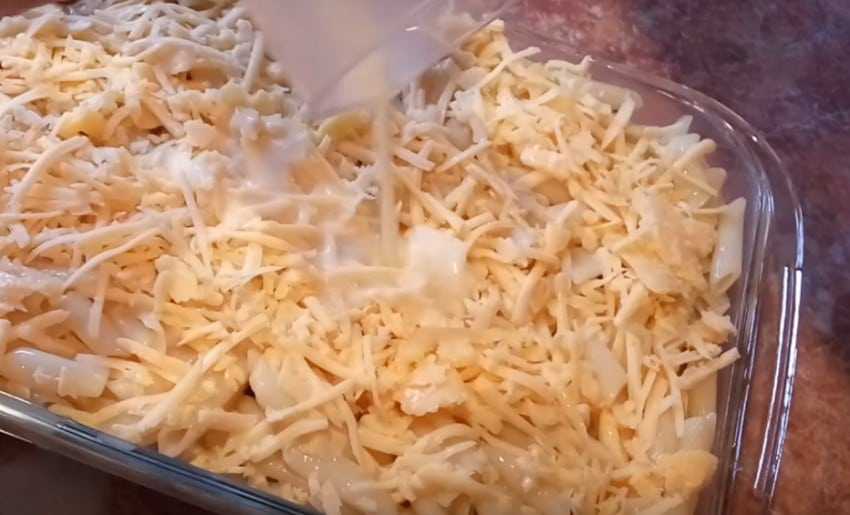 Шаг 6. Приготовленной заливкой аккуратно залить макароны с сыром, чтобы они не перемешались.