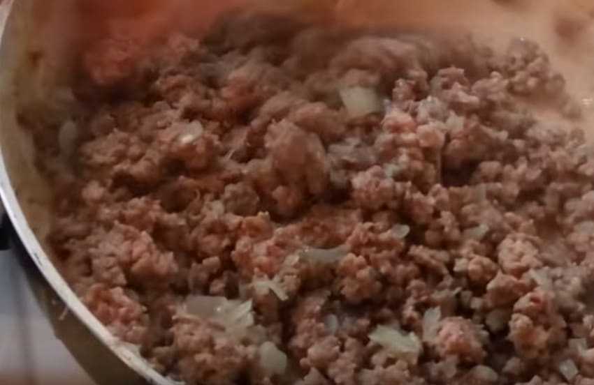 - На сковороде разогрейте немного подсолнечного масла. Добавьте мясную начинку и обжарьте до готовности.