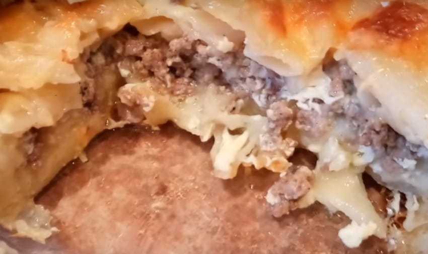 8. На них распределите оставшееся мясо и сырную стружку. Отправьте запекаться запеканку в духовку на полчаса. Подавайте ее к столу в горячем виде. На гарнир к блюду можно подать только свежий овощной салатик.