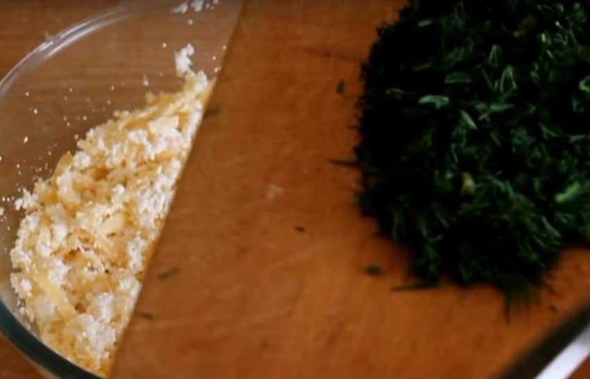 2. На мелкой тёрке натрите чеснок и отправьте его в творожно-сырную смесь. Мелко порубите свежую зелень и добавьте её к начинке. Тщательно перемешайте.