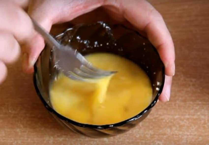 - В отдельной глубокой миске взбиваем вилкой 2 куриных яйца.