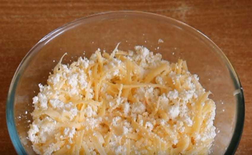 1. Для начинки натрите на крупной тёрке сыр. Добавьте к нему творог, щепотку соли и перемешайте продукты.