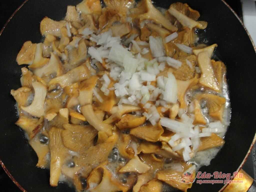 Свежие лисички отварить в подкисленной лимонным соком воде. Лук очищаем и нарезаем мелкой соломкой. Лук обжариваем на масле до мягкости.