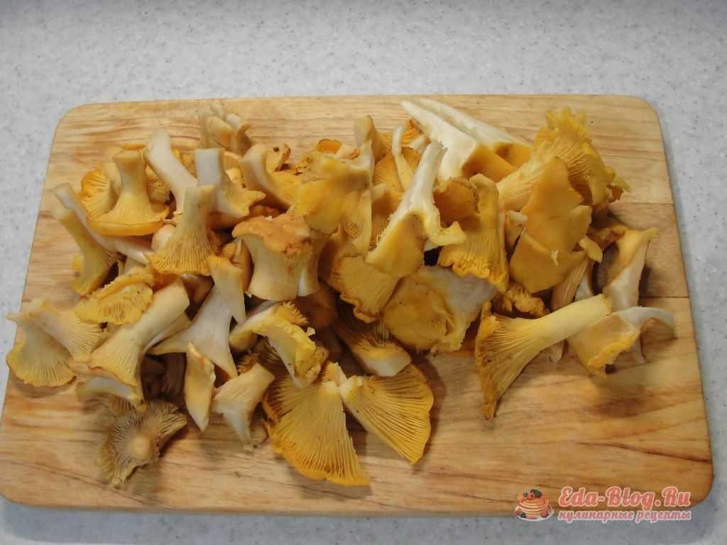 1. Подготовьте лисички, промыв их в холодной воде и обсушив. Если лисички слишком крупные, можно нарезать их на половинки или кусочки.