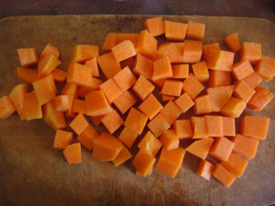 - Очистите и нарежьте тыкву на мелкие кубики. Затем варите их в подсоленной воде до готовности.