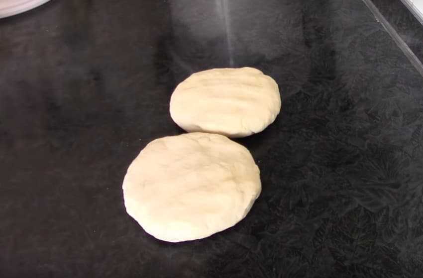 - Более простая версия – делаем из теста колбаску и отрезаем небольшие кусочки примерно одинаковых размеров. Раскатываем их в лепешку, стараясь сделать так, чтобы края были тоньше, а середина – толще.