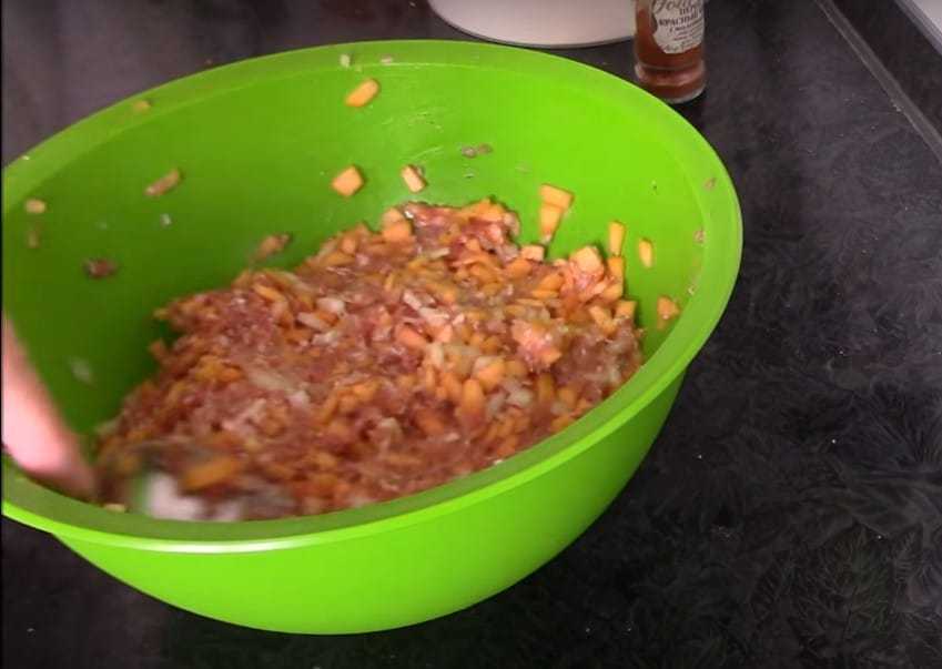 Соедините мясо с тыквой и луком, посолите и поперчите. Хорошо перемешайте. Начинка готова.