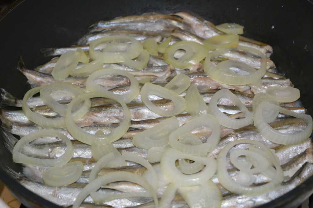 - Поверх лука плотно уложить мойву брюшками вниз, заполняя всю сковороду.