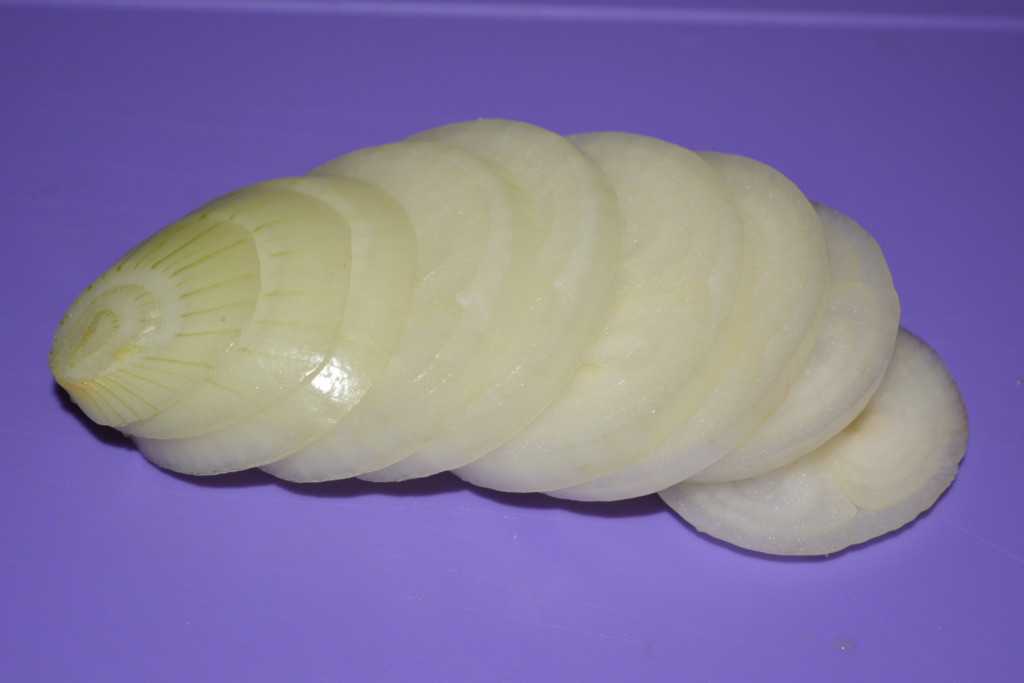 Теперь займемся луком. Возьмем одну крупную сочную луковицу и нарежем ее колесиками.