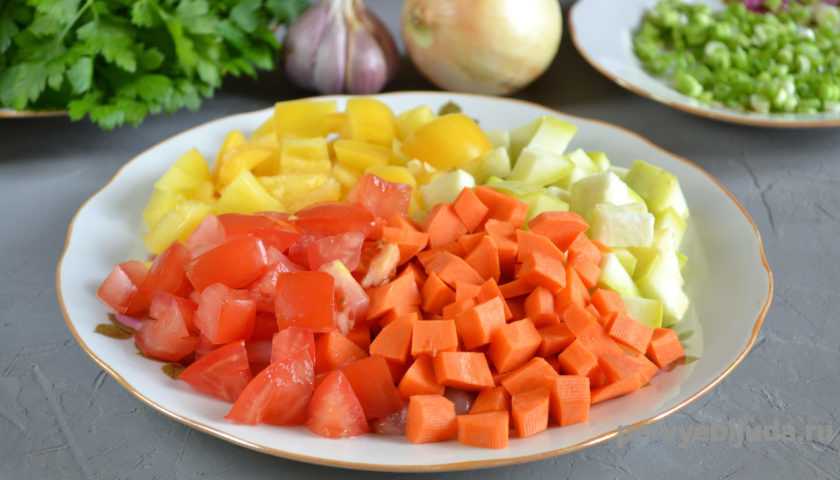 - Для начала подготовим основной ингредиент нашего рагу – овощи. Нарезаем следующим образом, чем овощ дольше готовится, тем мельче его нужно порезать. Предварительно хорошо промываем их и чистим.