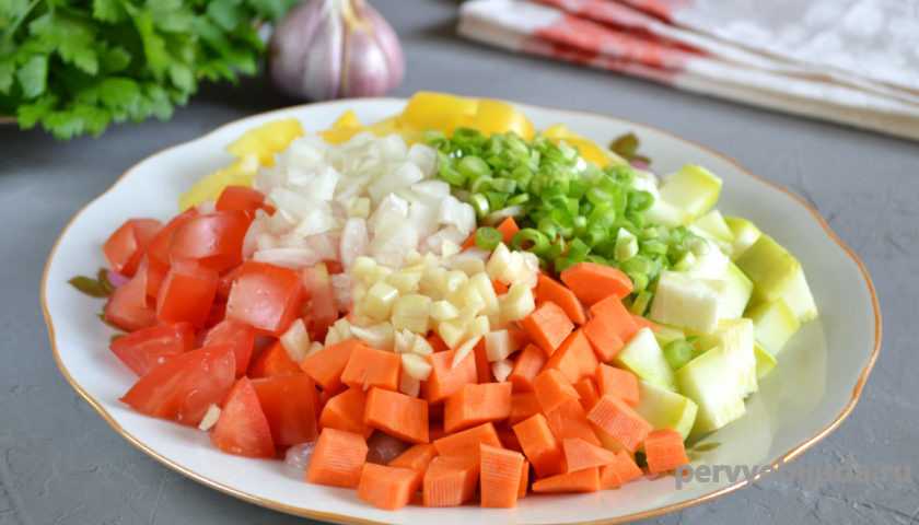 Чистим и моем картофель, кабачки, баклажаны, лук, чеснок и морковь. Заранее нарежем их, чтобы не задерживать процесс готовки и не отвлекаться.
