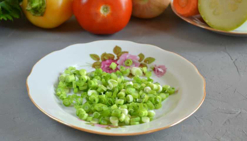 - Болгарский перец разрезаем вдоль, а затем нарезаем соломкой. Лук измельчаем полукольцами. Кабачки и картофель порубим мелким, аккуратным кубиком, морковь режем полукольцами или кольцами, в зависимости от того насколько крупный у вас овощ.