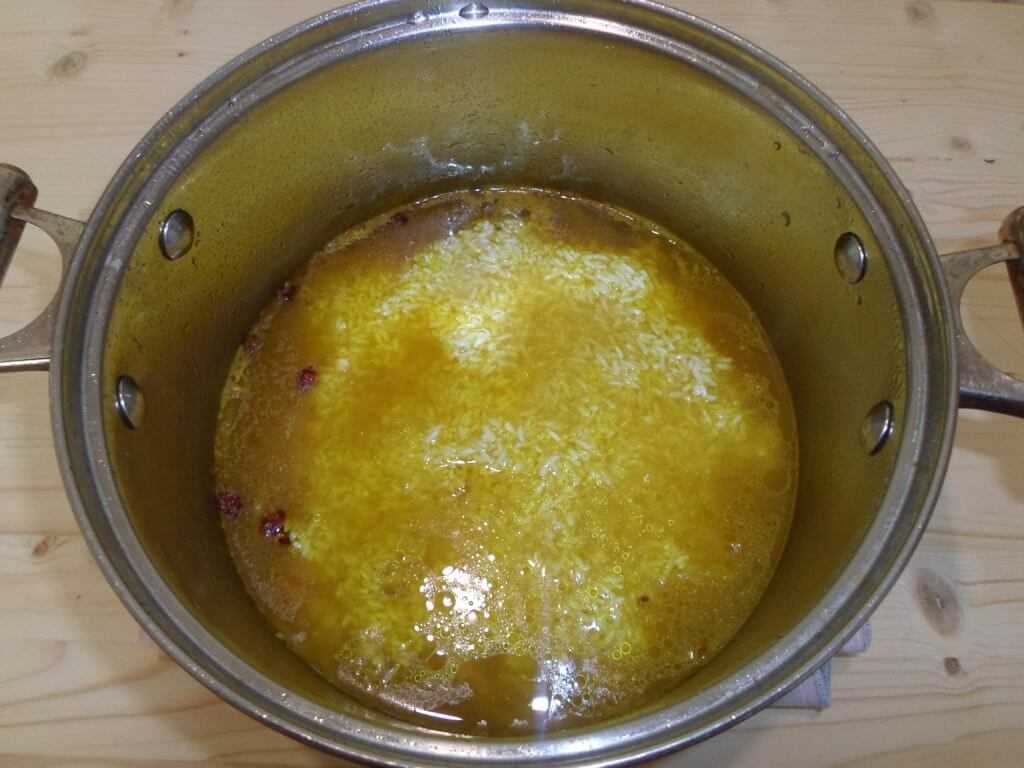 В готовый зирвак закладываем подготовленный рис (без воды) и потихонечку вливаем горячую воду (800 мл), в которую мы добавили соль и куркуму. Уровень воды над рисом должен быть не более 2-3 см.