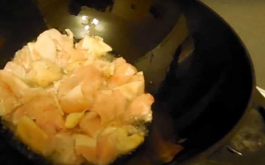 4. Вок разогрейте на максимальном огне, налейте в него масло. В раскаленное масло выложите курицу, постоянно помешивая, обжарьте ее 3 – 4 минуты.