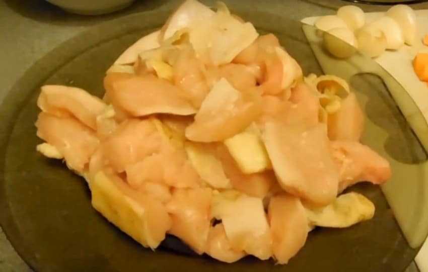 - Мясо ополоснуть, очистить по желанию от жира, нарезать ломтиками.