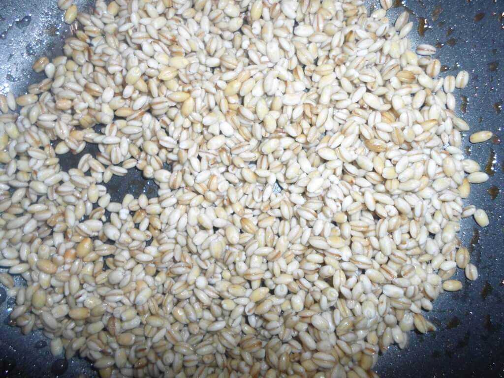 Перловую крупу хорошо промойте, просушите и откиньте на полотенце или сито, чтобы стекла вся лишняя жидкость. Положите крупу на сухую сковороду и слегка обжарьте.