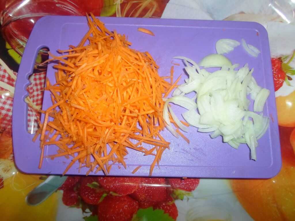 Репчатый лук мелко нарезаем, а морковь натираем крупно на терке.